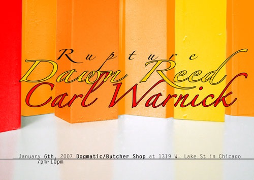 Dawn Reed and Carl Warnick: Rupture opens on January 6th 7pm-10pm, 2007 at Dogmatic/ Butcher Shop which is located at 1319 W Lake St in Chicago. After the opening Dogmatic’s hours are Saturdays Noon till 6pm, or by appointment [Michael Thomas at (312) 375-7757] February 3rd is the last day this show is up.