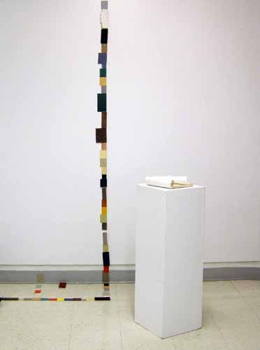 From 6-8pm we will be showing the installation ETERNAL COLORS by Aspen Court, poetic detachment used to describe a philology of color, tongue-in-cheek references to domesticity and the carpet samples themselves, cast-away icons of a homebuyers dream. The thin mosaic of multiform rectangular shapes bisect the space from floor to wall, forming a right angle that climbs to the ceiling, touching it. The right-angle hints at the room that is not there, and the minimal arrangements of color encroach upon a space where their use-function is obsolete, and it is precisely this uselessness that make possible the patterned forms of restrained color, old hues of familiar settings, displaced, to reveal their true beauty as objects. Before this arrangement stands a pedestal offering an old blank book whose pages have curled from neglect. The open-most page lays awry but tells us nothing. The empty book commands attention to itself as an object, and without words or pictures, this book, like the carpeted array of colors behind it, point elsewhere-