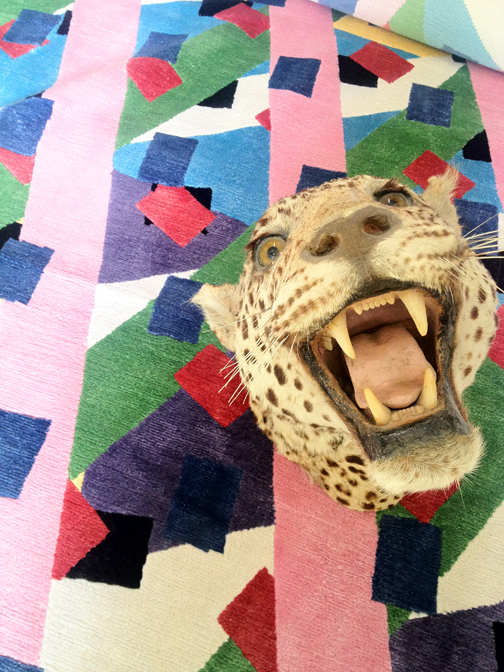 Multiplicities here collide and as importantly connect. All hanging like walls, the repetitious banners that appear to flicker and frame time are juxtaposed with a unique cotton quilt, an article that unfolds quite different metaphoric and temporal dimensions. The quilt bears a man-made design with organic variations in its internal repetitions, somehow mimicking but not quite surpassing what nature commands. Pyrite fragments and a taxidermy leopard head articulate their own fluent geometry and symmetry, and one could indeed be beguiled by the wonderful and exotic. Yet, equally dazzling is a hand-knotted silk rug that solidifies the use of this aesthetic ideal for real life outside a gallery setting. More than a whimsical grouping of textures, Salkin’s assemblage aims to direct our attention to what we value. The gathering of this gamut of patterned materials, including plants, a resin tile city and a “Biodome,” remind us of the many ways our material environment is ordered: in systems, in hierarchies, and most of all, in our heads.