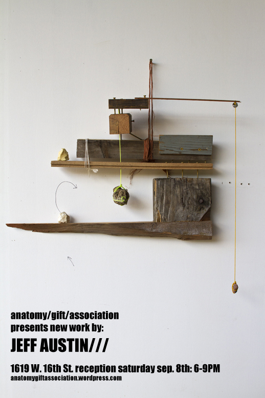 Please join us September 8th from 6-9PM as Anatomy/Gift/Association celebrates the grand opening of its exhibition space with new work by Chicago based artist Jeff Austin. This exhibition will include a number of Mr. Austin’s recent wooden constructions assembled during his residency at ACRE this Summer; sculptural wall hangings embellished with ephemera from the artist’s recent past and travels through the American West.