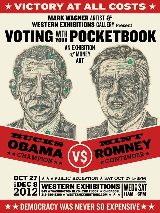 Portraits of the Barack Obama and Mitt Romney hang side by side, installed in a stylized voting booth. On close examination, viewers see that their faces are literally made of money. Cut up US dollar bills form their entirety… Federal Reserve seals become pupils, leaves and hollyhocks stand in for hair, framing and line-work twist to form the contours of each face. Given the materials used, it is unclear whether one should stuff a vote or a donation into the ballot box. “Voting with your Pocketbook” offers a critique of the US democratic process and its fixation on finance. Can a competition waged over ginormous campaign war-chests, PACs, and Super-PACs, really said to be democratic?