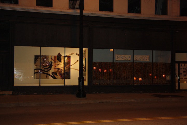 The Chicago Art’s District showPODs are stretched to their limit and beyond by Allen Vandever & Team ART!. While Allen fills seven spaces, four of the showPODs are in collaboration with four different artists. Allen uses the space by incorporating the windows, the wall, and the space in between. From creating a 3D effect (when you stand in the right spot) with Zore Sixtyfour to the mixing of styles with Jason Davis as their paintings merge together on the wall. Naqee’s paintings surround Allen’s the last the POD and, not to mention, the “Peep Show”, which was in collaboration with Joanna Przybylak. Needless to say, there will be plenty of surprises in store for the viewer.