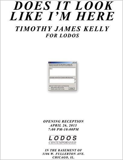 LODOS is pleased to present ‘Does It Look Like I’m Here’, a solo exhibition by artist Timothy James Kelly. The show opens on Friday, April 26th with a reception from 7-10 P.M.