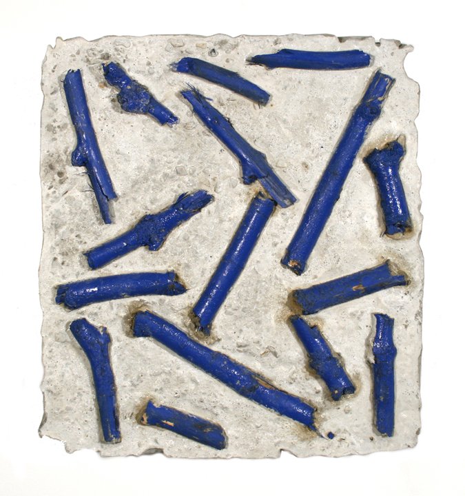 The immediate has become of increasing importance to Jones. The materials in his work are gleaned from his immediate surroundings, a process he has come to think of as foraging. Immediate also describes the way the works on view are made. The artist embeds material into concrete cast in the shape of a painting as it sets.
