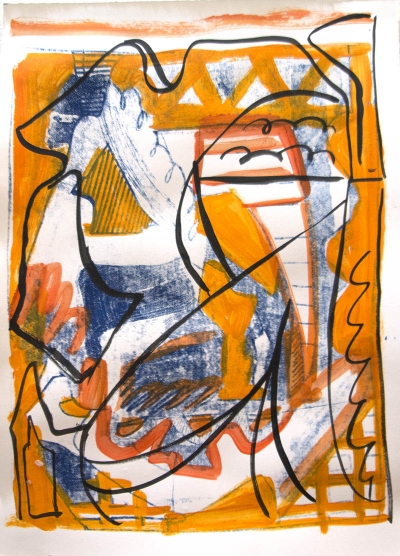 It is important, then, that my process of making the paintings is self-generative, in its subjective use value; when I am painting in the studio I aim to segregate the activity from “work-work” in order to label it as something more discrete and specific, that is, a process of image-making with an emphasis on composition using screen-print with acrylic painting. I work on the paintings horizontally and simultaneously, not with a linear narrative in mind but with an expansion outwards of color and form. To do so, I plein-air paint from my own paintings not towards realism but with an eye on capturing some kind of ‘gist’ of a composition, the way one might do a ten-minute gesture drawing in a figure drawing class (these were always my favorite exercises) or a partial-blind contour. As a result, the compositions and colors form a kind of DNA that solidifies across the paintings, which are visually somewhat inbred, with some genetic defects appearing in some works but not others but resurfacing to impair future generations. It is through this rigorous formal peeling-away framing time spent not as work but as “leisure” that I am able to access a distinct, circuitous, useful rather than exchangeable and self-satisfying process.