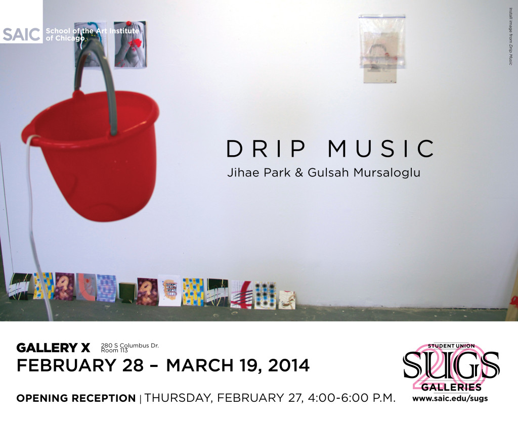 In Drip Music, artists Jihae Park (MFA 2015) and Gulsah Mursaloglu (MFA 2015) combine images and objects to create a unified situation that feels both familiar and unrecognizable. Buckets drip, photographs are drawn upon, and paintings rest on the floor. Relationships between the artists’ works suggest that our categorization of objects is porous.