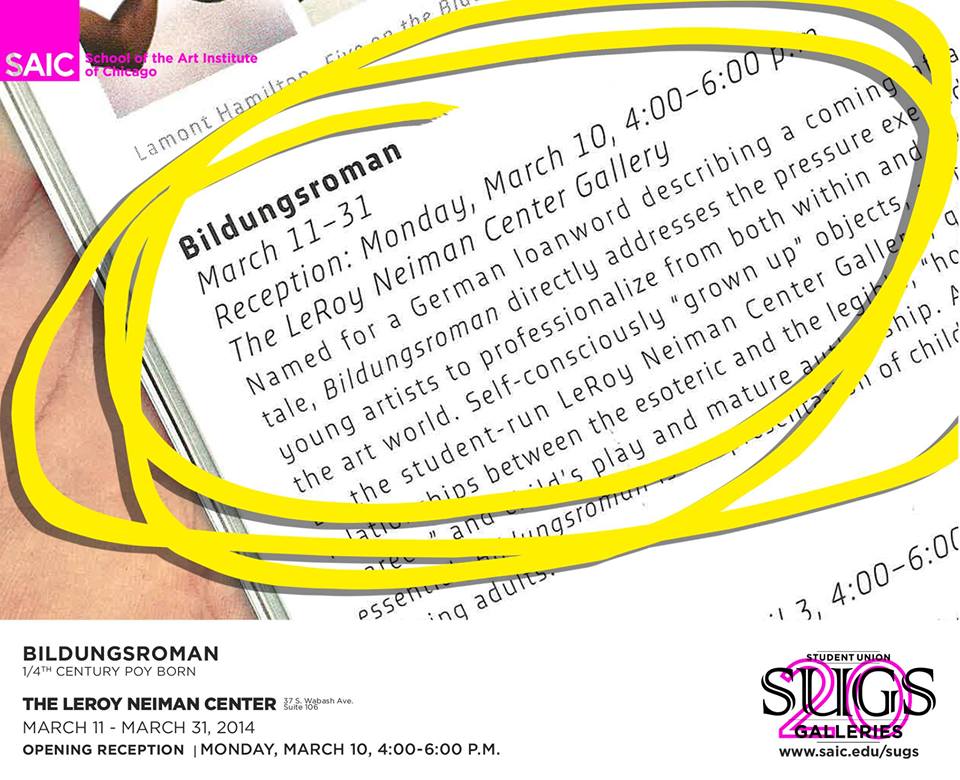 Named for a German loanword describing a coming-of-age tale, Bildungsroman directly addresses the pressure exerted on young artists to professionalize from both within and outside the art world. Self-consciously “grown up” objects, as framed by the student-run Leroy Neiman Center Gallery, question relationships between the esoteric and the legible, “hobby” and “career,” and child’s play and mature authorship. At its most essential, Bildungsroman is a representation of children playing at being adults.