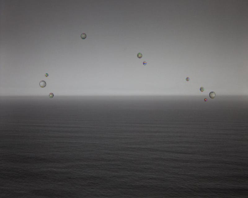 Nelemans’ artistic practice is rooted in an ongoing investigation of the construct of an image, specifically how digital images can be manipulated to contemporary notions of sight and seeing. In his Scapes in RGB series, the artist uses iPad screenshots of Hiroshi Sugimoto seascapes — retrieved by entering parameters into common search engines — and re-renders the image by adding water droplets to the screen. The droplets function as wide-angle lenses, revealing glimpses of the iPad’s RGB (red/green/blue) liquid crystal display.