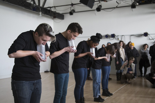 Vanishing Pont is a choreographic and auditive performance by Murat Adash exploring issues of the politics of movement and the disembodied voice. Belonging here is not bound to any specific location but to a system of movement. This system is one of regress and progress, creation and de-creation, possibility and impossibility. Five performers are moving in a geomteric grid while carrying a sound, progressing only to return to a state of erasure. Movement returns to stillness. Noise turns into silence.