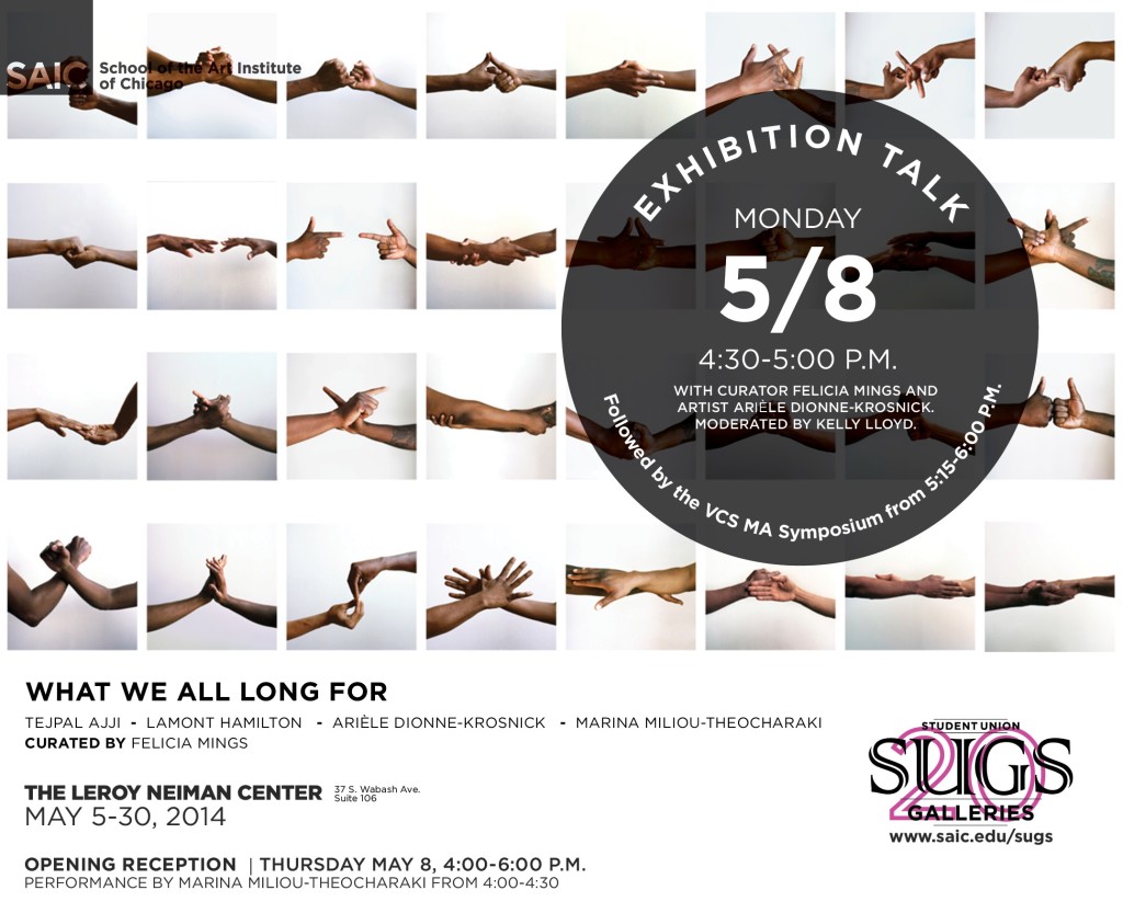 Join us at the opening reception for What We All Long For, featuring a performance by Marina Millou-Theocharki and a conversation with curator Felicia Mings and artist Arièle Dionne-Krosnick moderated by Kelly Lloyd. The reception will be followed by the Visual and Critical Studies Masters of Arts Symposium.