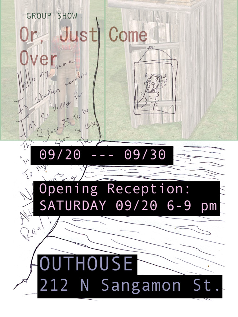 Outhouse is pleased to announce our inaugural show opening on Saturday September 20th. Or, Just Come Over is a group exhibition that surveys a community of emerging artists bonded by medium, locality, and conversation. These artists, of whom we consider colleagues and friends are the foundation of the community involved with Outhouse. Please join us as we open our doors for the first time and celebrate what we hope to be an exhibition space ripe with prosperity.