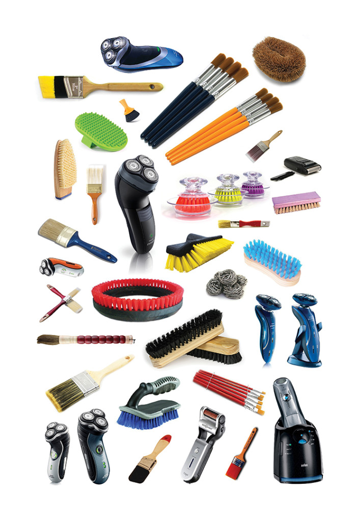 Covering the walls in the gallery are Jeff Gibson’s stream of internet-mined images, placing the viewer within the endless scroll of a Google image search. Unlike the daily supply of images purposefully prodding the visual plane via advertising, the .jpegs and product snapshots that Gibson culls are brought to attention by choice, produced through the artist’s own volition. The wrap-around repeat-patterning of Product (2014) is purposefully produced to adapt to any space, just as its objects within can be called upon, or found, by any individual with just a few keyboard strokes. The acutely organized objects are not specified or branded images, but those available to the masses— innocuous gems taking the shape of donuts, stilettos, wing nuts, and fluffy croissants.