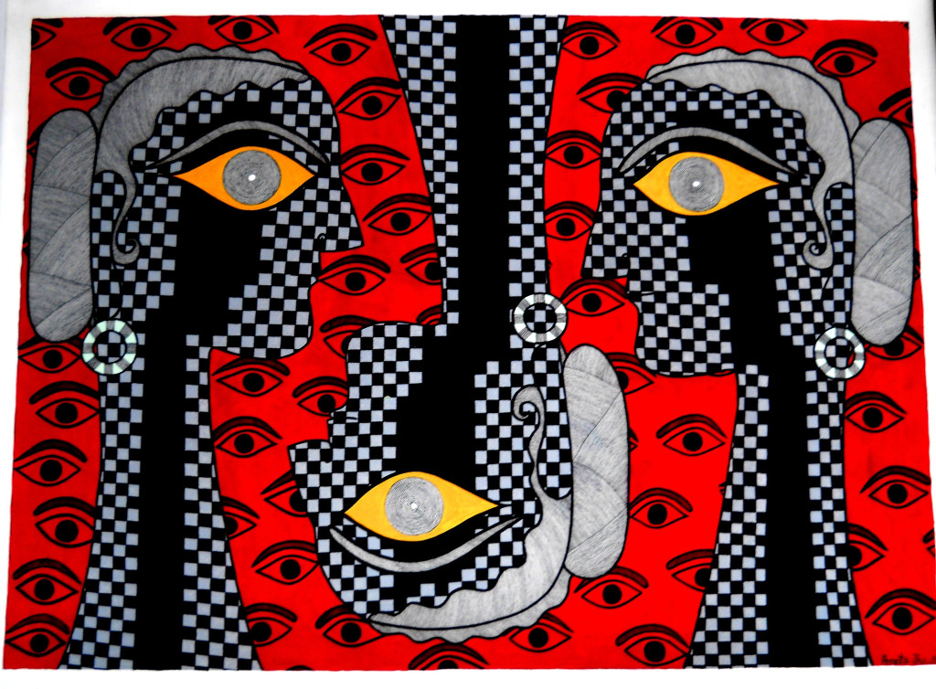 The art featured in “Traditions in Transition” is inspired by standards from four different Indian art traditions: Madhubani, Gond, Warli, and Bengal Patachitra. Media includes ink on paper, acrylic on canvas, cow dung and water based color on cotton cloth, charcoal and gouache on cotton cloth, and more. In creating the works, each artist has made a conscious effort to shift the parameters of each tradition to a more unique individualistic contemporary creative level. Although different in style and subject matter, all make reference to history, religious beliefs, and the social customs of their communities of origin.