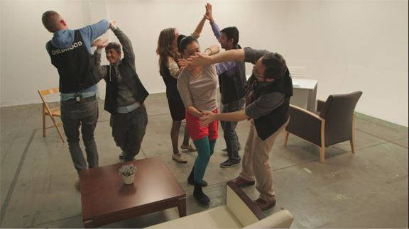 Einat Amir investigates contemporary socio-political issues through works that oscillate between video and per- formance. I Will Be Your Guide for This Session follows two groups of participants as they embark on a journey examining personal narratives through psychoanalytic and physical exercises. Through the direction of two pro- fessional guides, the boundaries between the performative and the authentic are challenged. The participants of these two groups were volunteers selected through an open call and asked to choose a vest emblazoned with a word, such as “childhood”, “sex” or “happiness” amongst others, that provided an additional emotional trigger during the session. The outcome of this experiment was unpredictable. The filmed sessions were not scripted or rehearsed, appropriating methods used by Reality TV into this layered and complex artwork. I Will Be Your Guide for This Session is part of a larger project, Our Best Intentions, which is both video installation and live performance and was previously shown at the performance biennial Performa13.