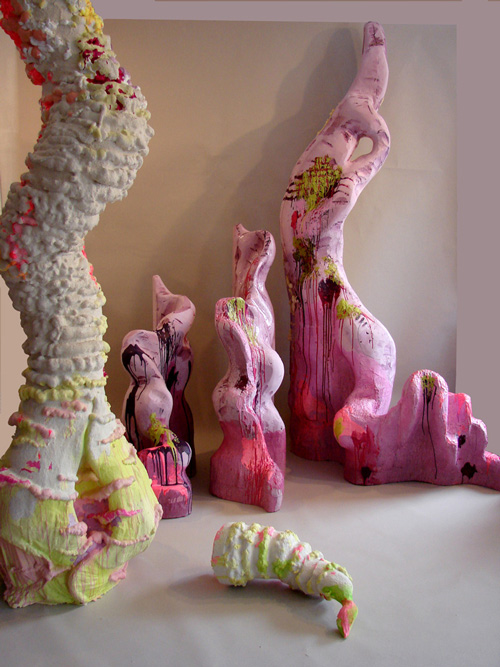 The site specific installation disrupts the horizontality of the hallway gallery with looming helix forms swirling towards the ceiling to create a man-made forest for visitors to navigate. In the lobby, plastered pods of porous bulbs made from plastic Easter-egg containers and other found materials hang under the central staircase. Despite her use of playful and cartoonish color, Rosenheim’s installations are not whimsical; rather, they explore the capacity for nature to become an all-encompassing—even destructive—force through its ongoing negotiation with humanity.