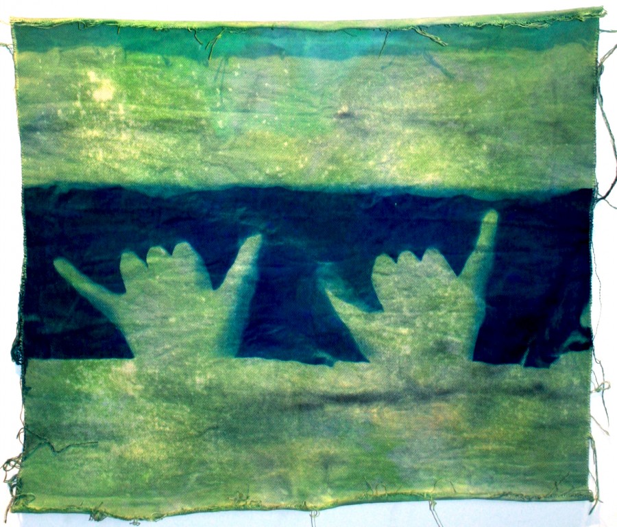 Galligan’s work features text printed onto fabric in a resist dyeing process using cow dung, red pitaya and the boiled down remnants of an Australian energy drink called ‘Mother’ and the American soda ‘LaCroix’. Through these coagulated texts, images begin to bely their content. The starting point for the work is a series of images that mask what the eyes see. For Galligan, the work revolves around “a dragon fruit, a political speech with a meter that sounds true and an effervescent drink that births a god”.
