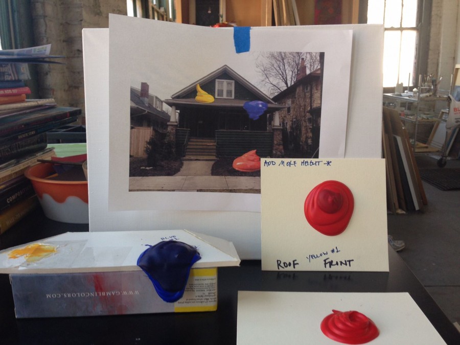 Red, Yellow, Blue recalls days of playful pranks while celebrating the power of Painting. Capturing the moment of limitless possibilities when paints are first placed on a palette, Wasson re-imagines a suburban rooftop and front yard with her shiny primary colored blobs.