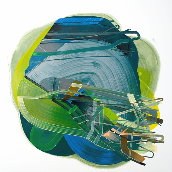 By choosing when to show gravity, perspective, atmosphere, and light, I create impossible object/environments and emote through them. The raw energy of my need to make decisions and create outside motherhood charges the images with urgency. I propose a multidimensional diagram of anxiety and the desire to overcome it. The paintings allow me to transform my feelings of dread and insecurity into something physical, tangible, and beautiful; a bittersweet beauty that is brightened by the shadow it casts. I am trying to come to terms with the belief that this is the best of all possible worlds; the possibility that beauty’s fullest potential is achieved by coming through darkness. Silky ink stains, oozy acrylic pours, and airy swaths of spray paint float and morph as brushstrokes of oil paint in varying weight nest and knot across an ambiguous horizon. A squishy body attempts to protect itself with a labyrinth of piping that underpins and armors it. A repetitive alignment of struts or bones elicits sound at a specific tempo. The paintings live, breathe, and beat