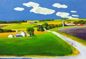 In recent years he has painted the Midwest landscape as viewed from the roadside. His bold use of color and strong sure strokes pay tribute to the landscape; they invite the viewer in to experience the broad vistas of the Midwest. In Sponberg’s words: “We often mark the significant events of our lives and fail to note the passages that lie in between. In using the Midwest landscapes as subjects of these paintings I am calling attention to the extraordinariness of the commonplace, the in-betweens of the celebrated places as well as the in-betweens of our lives.” Sponberg’s work is found in numerous private collections. He has had work shown in solo and group exhibitions in Sweden, New York, and the Chicago area.