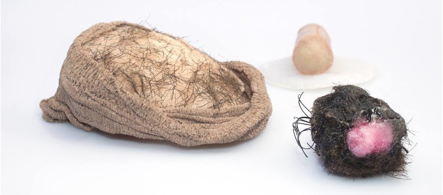 Krebs is best known for ensemble-performance works that investigate the vulnerability of bodies driven to achieve extreme efficiency or bodies surveilled by concealed systems of power. Revisiting sculpture after a 12-year hiatus, Krebs addresses awkwardness, intimacy, violence and seduction in the 40 fleshy specimens that comprise Minor Local Slumpage. They range in size — some similar to sushi, others closer to a softball — and reveal familiar materials, like a shoulder pad, a piece of fake baloney, or hair pulled from a drain. Many appear to have been disturbed; skewered, scraped, disemboweled, or encased in rubber. If asked for their manifesto, these works might reply: