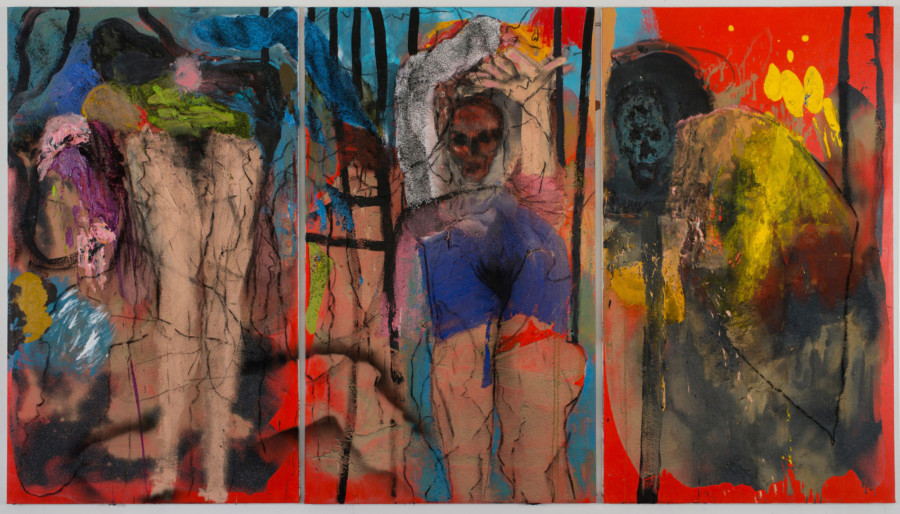 In most of these works, Dine has built up a heavy impasto surface. By mixing sand into the acrylic paint, he has developed a process in which he is continuously revising his own work. In the studio, Dine moves between building up layers of gritty paint and blasting them away with power sanders and other tools. The exhibition is made up of large-scale and multi-panel canvases. The largest, Errant Rays and Seeds Escaping (2015-16) measures nearly nineteen feet in width and loosely depicts bodies coalescing and fragmenting amid vividly pigmented impasto.