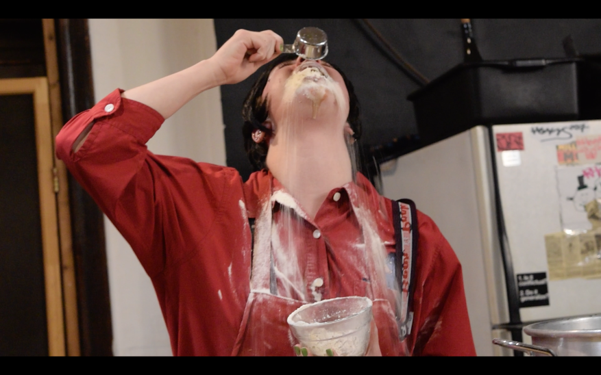 A mom hair wig, matching Winnie the Pooh overalls and shirt, the smell of banana chocolate chip muffins, the sound of spitting, the sensation of powder drying out your mouth, gargling, the sound of wet banana mush and spit smacking as it lands in a bowl, gargling, the taste of fresh baked muffins. An interaction between a family muffin recipe, its ingredients, and the mouth. Embodying the super mom and the mother bird, Holly carefully measures out each ingredient using the volume of their mouth.