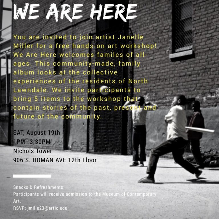 You are invited to join artist Janelle Miller for a free hands-on art workshop! We Are Here welcomes families of all-ages. This community-made, family album looks at the collective experiences of the residents of North Lawndale. We invite participants to bring 5 items to the workshop that contain stories of the past, present and future of the community.