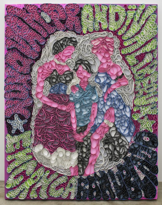 Post-it note pads show what could be childrenâs drawings made while waiting in a parentâs office, if not for their monumental scale. Although Lermaâs bright colors and lush material are what one first perceives in this exhibition, there is an underlying notion that bad behavior is overlooked for those in power, be they figures from finance, art, politics or personal history. Through this latent subject matter, Lerma points to sociologist Pierre Bourdieuâs concept of the various forms of capitalâeconomic, social and culturalâand their intersection. This is evident in the work, Civil War Cockades. While its base mimics a stack of classic yellow post-it notes, the paintingâs surface is overwhelmed by oversized cockadesâknots of ribbons popular in the 18th and 19th centuries both as representations of political affiliations and a part of a servantâs livery. Simultaneously demarcating the contradictory positions of political agency and servitude, the cockade in multitude complicates its meaning and blurs the boundaries between social strata. A related work, Rigo as Julio Iglesias as Emmanuelle, uses quilling, a technique once relegated to 18th century women of leisure, to replicate a style of armchair with multiple associations to Lerma: a famous porn film; a Julio Iglesias album cover; Lermaâs childhood home.