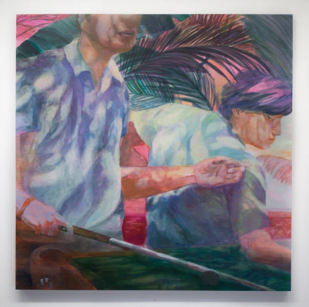 Glowing screens illuminate private places. Interiors that hold quiet moments and intimate relationships. Minami Kobayashi captures these with translucent mark making that suggests figures, space, narrative. Her rapid brushstrokes create an uncertainty with a shifting sense of depth and transient movement. In the apathy that occurs after climax, female figures often dominate the canvas in a marked reversal of latent modernist language.