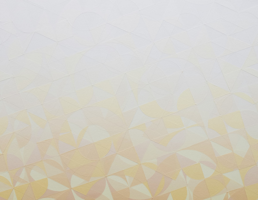 Pierce implements a relief painting process by taping off geometric-based grids and applying several bold gradients of acrylic. The tape is removed to reveal rigid layers of accumulated paint that have formed triangle, square, and circular shaped patterning across the canvas. Although his use of geometry is informed by the Op Art movement of the late twentieth century, he dedicates his practice to confronting the expectations of the errorless, measured precedent set by Op Art. His subtle inconsistencies and evident brushstrokes violate this expected, calculated abstraction and lend itself toward a more unpredictable form. The interruptions circumvent the viewer’s perception and create a phenomenological experience by challenging the viewer’s ephemeral transition between comprehension and delusion.