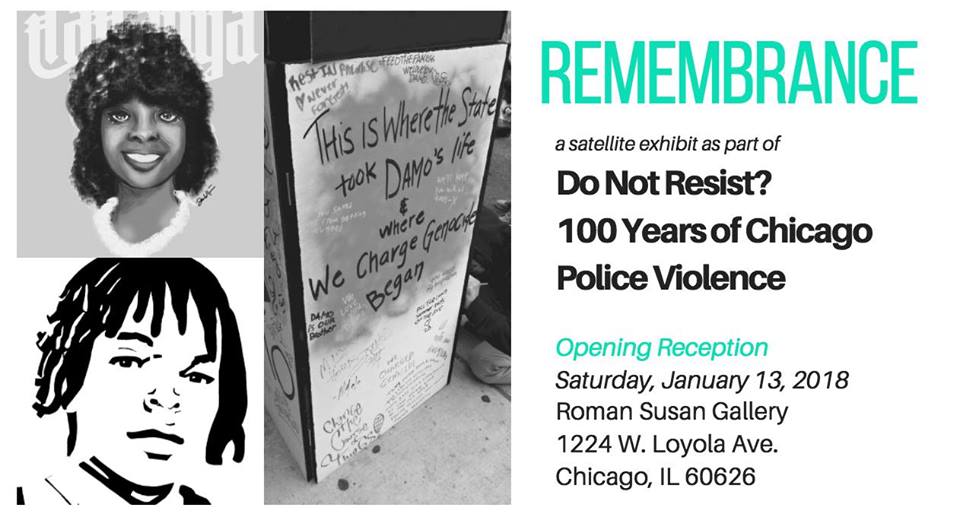 Join as at Roman Susan Gallery on Saturday, Jan 13th, as we remember and honor those we’ve lost to Chicago police violence. Hear from Rogers Park residents in the fight against police violence on REMEMBRANCE as crucial to why we fight and continue to demand the impossible.
