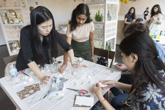 Edra Soto hosts monthly workshops in the Commons as part of Open 24 Hours, inviting visitors to transform discarded liquor bottles—as well as refuse from their own neighborhoods—into beautiful artworks.