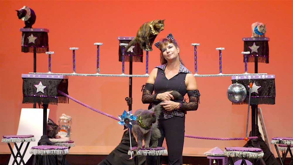 The American dream scampers in on frisky cat paws for Samantha Martin, raised in tiny Princeton, Illinois, when she finds her life’s mission training rescue cats for her own unique traveling cat circus. While finicky guitar-playing, tightrope-walking, juggling feline stars with names like Tuna, Pinky, and Oz, are the center of this endeavor, often delighting audiences by demonstrating minds of their own, their mistress is the certified heroine of this documentary. Director Feiring followed the circus for more than five years, chronicling Samantha’s unflagging struggle to maintain the show against formidable economic odds, thrilling pet-loving patrons across the nation with laid-back routines, homegrown charm, and training tips, even as she deals with personal issues of love, loss, and fears for the future. ProRes digital. (BS)