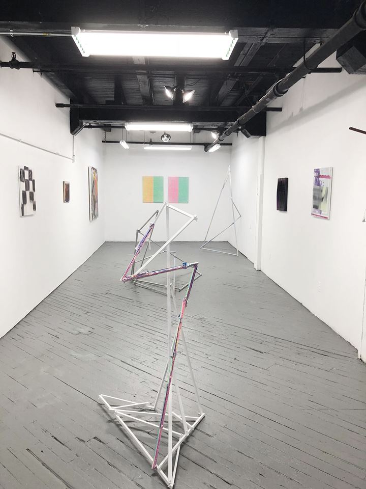 Holographic Body is a group exhibition featuring works by Michelle Bolinger, Gina Hunt, Katy Kirbach, Nicole Mauser and Erin Smego. The pieces embody art’s paradoxical attributes of light and material, i.e., representation and object. Each artist is processed based; weaving fabric, excavating space through erasure, or layering pattern over pattern, such that the subjectivity of visual experience mingles with material relations. This disrupts perception as forms emerge and disperse. The works are unabashedly formalist and abstract, while still being immersed in contemporary visual culture.