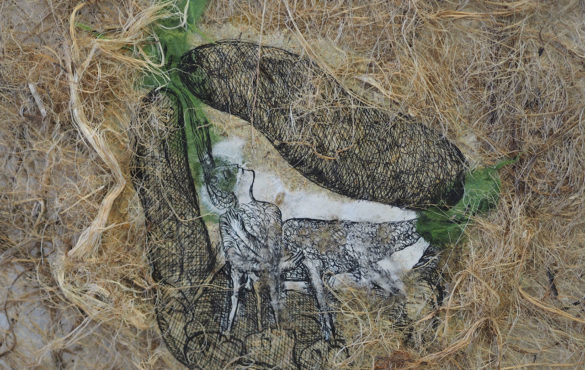 The visual content of the Moussavi’s work for this exhibition is personal and intimate, consisting of etchings that depict creatures entangled in a natural space. As she explores the ties between individual and environment, she begins to unearth emotions, associations, and memories that one attaches to physical spaces to discover the abiding bond between nature and us.