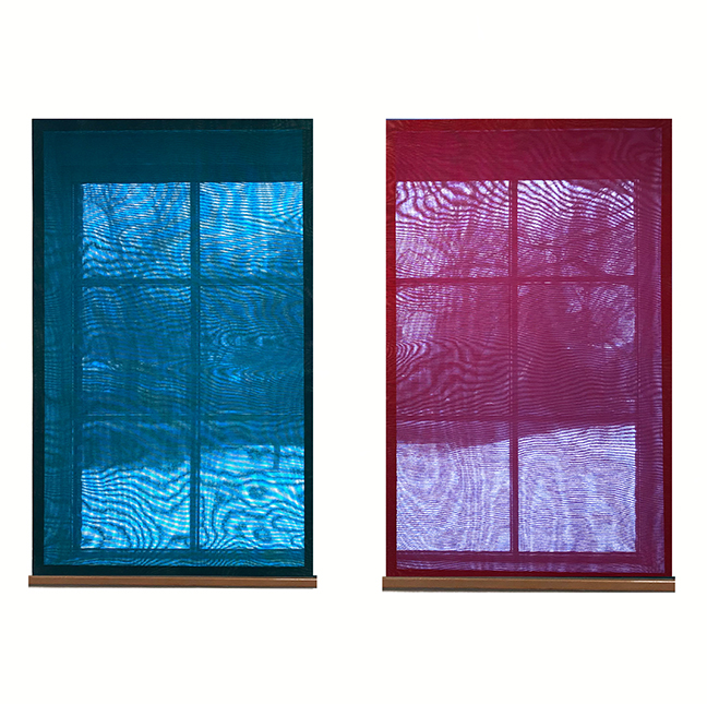Hunt has long been interested in “technologies of imaging through the medium of light,” from her early cyanotypes on rice paper, to her more recent paintings on cut and twisted canvas, to her current installations employing hand-dyed theater scrim. She began using scrim while traveling for residencies and a fellowship in 2016 not only because of its malleability and durability, but also its “magical ability to become translucent or opaque depending on the light source.” Surprising interference patterns are formed in her layers of the thin cotton mesh. Hunt’s research has recently yielded: a triangular installation of colorful screens at Badlands National Park in South Dakota; layers of polyester netting stretched between metal poles on Virginia Commonwealth University’s campus in Doha, Qatar; rectangular window coverings at University Galleries of Illinois State University and Drew University in Madison, New Jersey; and an outdoor information booth wrapped with vibrantly colored screens at the now-closed Fergus Falls State Hospital in Minnesota.