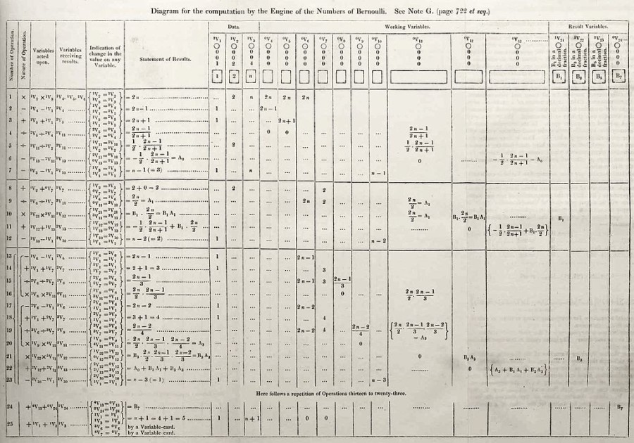 [1] Augusta Ada King-Noel, Countess of Lovelace (née Byron; 1815–1852) was an English mathematician and writer, chiefly known for her work on Charles Babbage’s proposed computer, the Analytical Engine. She was the first to recognize that the machine had applications beyond pure calculation and published the first algorithm intended to be carried out by such a machine. As a result, she is often regarded as the first computer programmer.