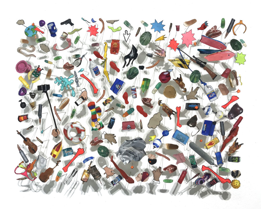 Rachel Grobstein creates miniature paintings and sculptures, filtering real world objects through a painstaking handmade process while inviting close scrutiny through a radical scale shift. Her recent works take the form of accumulations and visual inventories in both real and imagined categories. Cut from paper and installed directly onto the wall with pins, Grobsteinâs groupings of miniature gouache paintings reference the cataloguing of natural specimens while creating architecture of shadows. They articulate themes of space junk, zodiac charts and the mythology of the constellations to explore daily routine and consumer detritus.