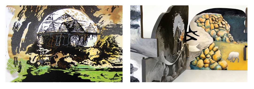 Using painting, printmaking, drawing, and digital imaging, I choreograph the recurrent iconography of my immediate surroundings to suggest visual narratives. I mount printed imagery onto organically shaped wood or interlock wooden panels to form sculptural panoramas. My imagery includes animals such as the lamb, a nod to agriculture and the animal’s loaded iconic value, as well as jewel-like clusters of ice or silhouetted haystacks. The fragmented imagery that I composite together arises from encounters with beauty, generosity, humor, and conflict in a landscape that teaches keen observation.