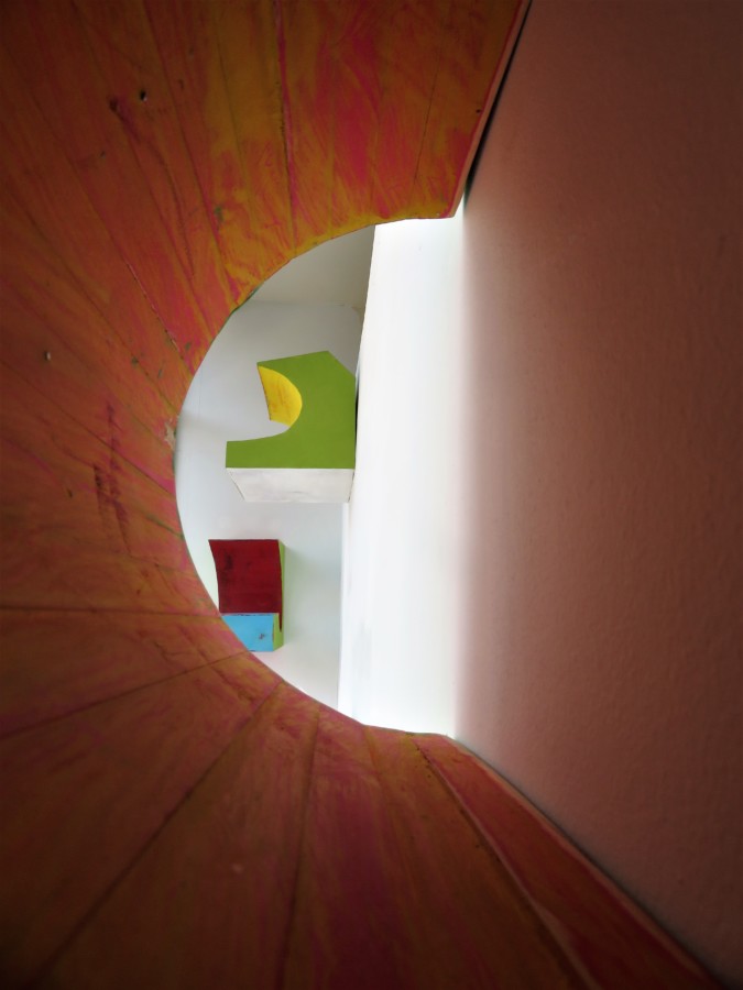 An avid collector and traveler, Scott Mossman’s sculpture have always been colored by a fascination with the object and interior spaces, as well as a sculpture’s relationship to the wall where it’s hung, the viewer and the gallery space. His pieces are often hung well above the viewers head, wrapping around or placed within corners, or jutting out from or above doorways rather than the “traditional” spot at eye level or on a pedestal. This placement poses questions about the function of a piece of art within a space. Often referencing artifacts and architectural prototypes from various cultures and eras, his work appears to serve a purpose other than art—although the purpose of the eccentric, abraded tool, appliance or architectural detail is not as obvious as the fire alarm, security sensor, duct, heating unit soffit or molding that occupies a similar spot in an interior.