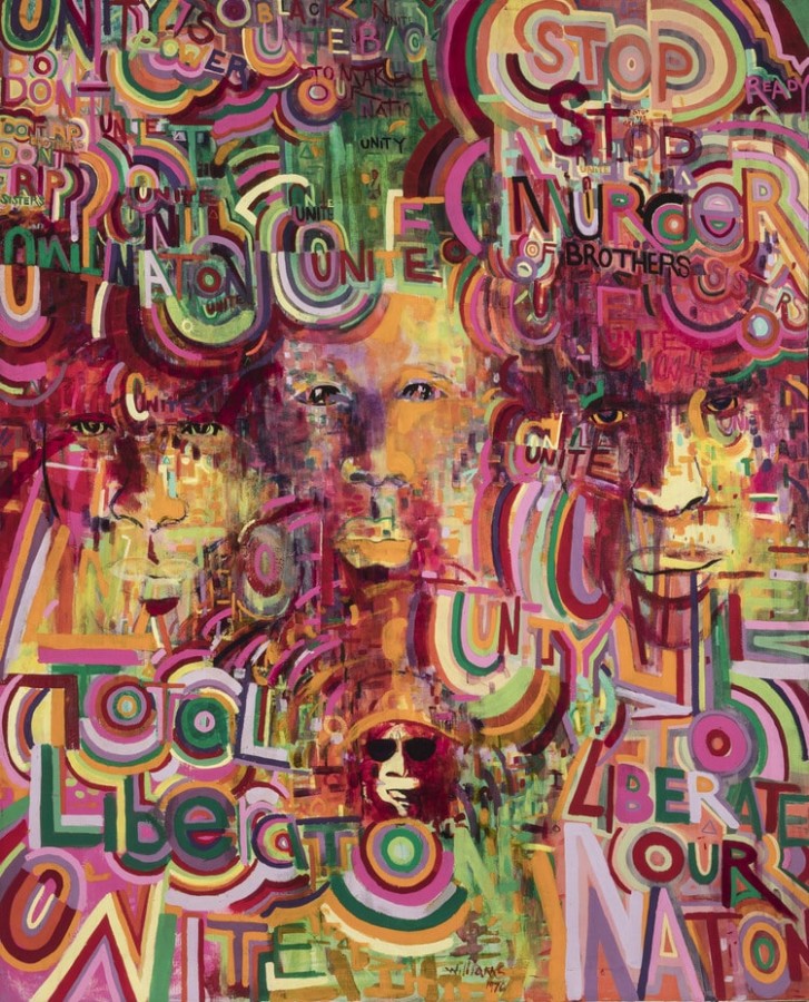 Top: Gerald Williams, Messages (detail), 1970, Acrylic on canvas. Smart Museum of Art, The University of Chicago, Purchase, The Paul and Miriam Kirkley Fund for Acquisitions, 2017.8.