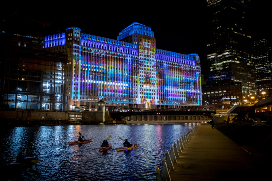 In the spirit of Chicago’s great legacy of public art and culture, Art on theMART is the largest digital art projection in the world. The first-of-its-kind for Chicago, projected across 2.5 acres (two football fields) of theMART’s exterior river-façade, this contemporary art projection adds to the city’s vibrant public art scene. The installation includes four contemporary digital artworks by artist Diana Thater, Zheng Chongbin, Jason Salavon and Jan Tichy, each using 34 projectors to illuminate the façade of theMART. This ongoing series of curated projection programs is displayed two hours a night (7 – 9pm), five days a week (Wednesday – Sunday), for ten months of the year (March – December). The projections will be temporarily unavailable from November 7-11, returning on Nov. 14. The City of Chicago and theMART are working in partnership to manage and curate the projected artwork and have a thirty-year agreement to facilitate the project.