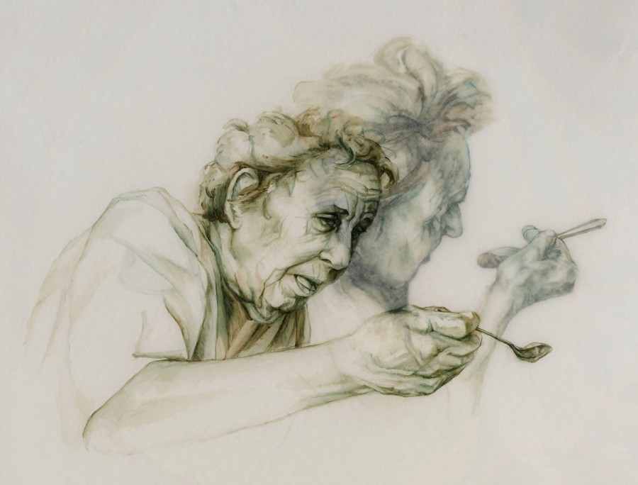 Porterfield’s drawings are influenced by her work as an occupational therapist and her interactions with patients and their caregivers. In painting on transparent, glassine paper, she progressively layers her images to address reoccurring struggles in healthcare that are outwardly hidden or forgotten. With her grandmother as her model, she hopes to convey the loss of identity that can occur as degenerative illnesses affect one’s ability to complete self-care or functional movement. The underlying layers represent the obscured sense of self that attempts to overcome those difficulties.