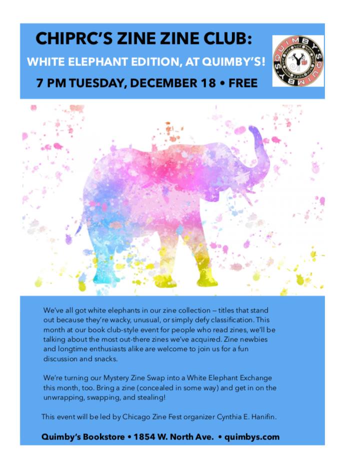 We’ve all got white elephants in our zine collection — titles that stand out because they’re wacky, unusual, or simply defy classification. This month at CHI PRC’s Zine Zine Club, our book club-style event for people who read zines, we’ll be talking about the most out-there zines we’ve acquired. Zine newbies and longtime enthusiasts alike are welcome to join us for a fun discussion and snacks.