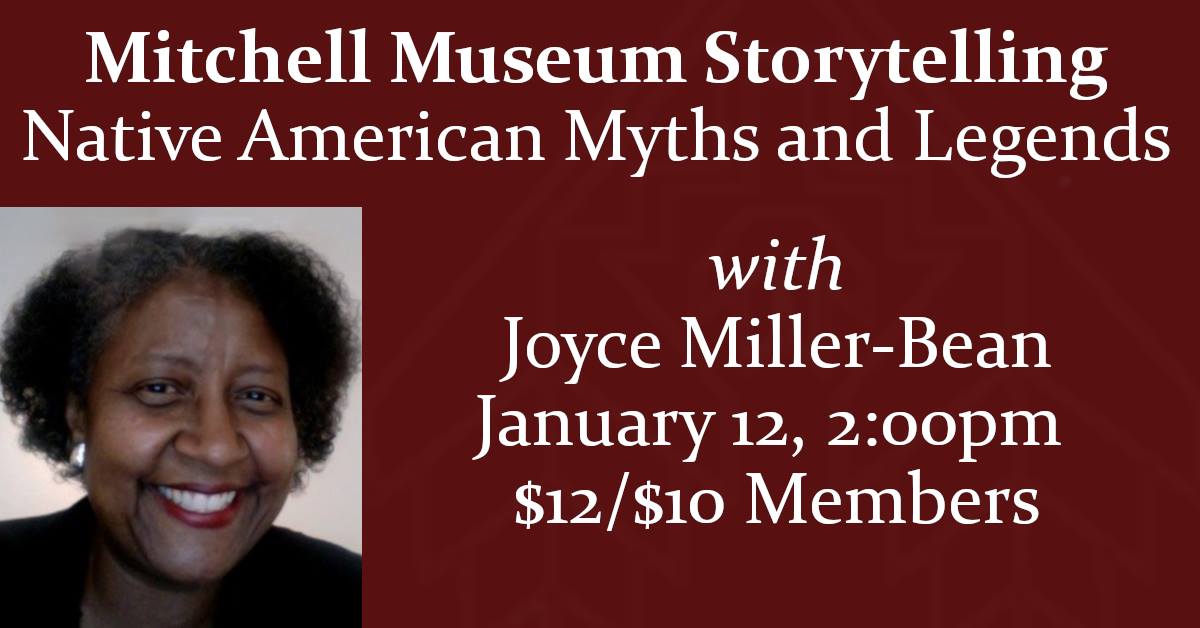 Storytelling is one of the oral cultural traditions of tribes from coast to coast. On Saturday, January 12, 2019, the Mitchell Museum will host Joyce Miller-Bean for a family storytelling program on American Indian Myths and Legends. Joyce Miller Bean is Afro- American and Native American of the Mvskoke-Creek tribal nation. Joyce has been a professional storyteller for over thirty years. Her stories will be family friendly and appropriate for all ages, so bring the family along!