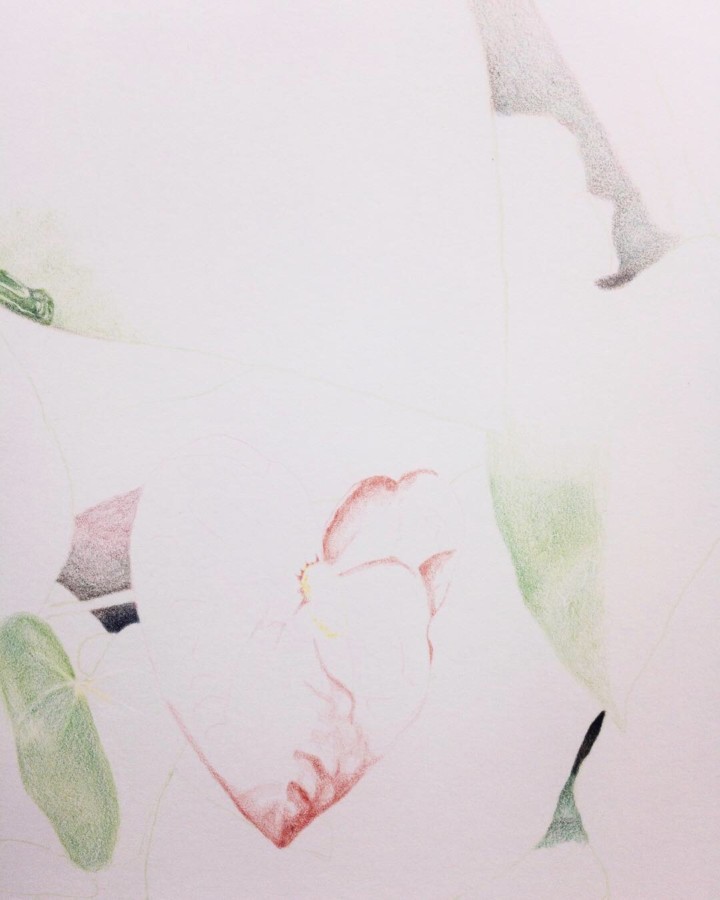Apparatus is pleased to announce Always Touches on a Flower, an exhibition featuring works by Alejandro Jiménez-Flores and Cathy Hsiao. Titled after a misremembered, and somewhat inverted quote by Jean-Luc Nancy, Always Touches on a Flower, explores ideas of about intimacy, memory, time, and the floral. Jiménez-Floresâs process-oriented paintings and drawings deal negotiate the between time and its embeddedness in the image through repetition and transfer. They create subtle, shifting and rhythmic surfaces where in images emerge, brush against the surface and slowly disappear only to emerge perhaps elsewhere. In a similar fashion, Hsiao probes ideas of emergence, surface through colorful casting processes using concrete and floral dyes and materials. For this exhibition, Hsiao has focused on C-clamps, a common construction tool used to hold objects together, but also leave behind a vestige of their use in the gap kept between the top and bottom clamp marking a sort of memory imbued to the object. The literal gaps in the clampâs memory of have been scaled to correspond to the dimensions of work Jiménez-Flores has made for this show, allowing the objects to engage in in a call-and-response across the room. For Jiménez-Flores and Hsiao, the image is an object that simultaneously reaches out, and remains opaque at the same time, cutting itself off, only to reveal a different bit perhaps later. Yet, each artist complicates this maxim through the repetition of form and image across surfaces, even to the point of allowing their work to speak to one another directly. Images brush against their own surfaces and reach out to the surface of others engaging in a shared intimacy and memory of one another inviting the audience to partake as well.