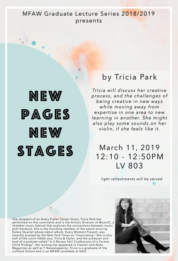 Join SAIC’s Writing Program for our Graduate Lecture Series event with the wonderful Tricia Park’s lecture entitled, NEW PAGES, NEW STAGES, where she discusses the challenges of being creative in new avenues and might even play her violin. Don’t miss it!