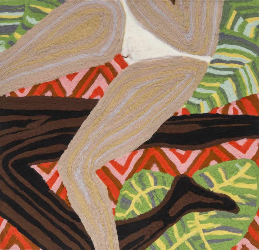 Pope’s new works draw upon the motif of the leisured nude figure, a classic image woven throughout the fabric of the art historical canon. Upending the trite narrative of the male artist, who, in projecting his own ideas of the female form, creates a partisan image, Pope presents both the female and male form in sensual, insightful entanglement. In part, the work depicts the simple delights of nudity, portraying two figures as they lounge, unabashedly exposed to the viewer, at times intimately intertwined. Composed of tactile, sensual lines, their bodies sprawl across an imagined natural setting consisting of floral colors and tropical plants, evoking both an Edenic tranquility and carnality. However, a paradisiacal simplicity becomes complicated by longstanding historical and political association: what are the implications of a black and a white body lying together?