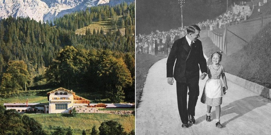 Image: Left: Heinrich Hoffmann, postcard of the Berghof, Hitler’s mountain home on the Obersalzburg, ca. 1936. Right: Heinrich Hoffmann, photograph of Hitler escorting a girl to his Obersalzburg house, from Hoffmann’s Youth around Hitler (1934).