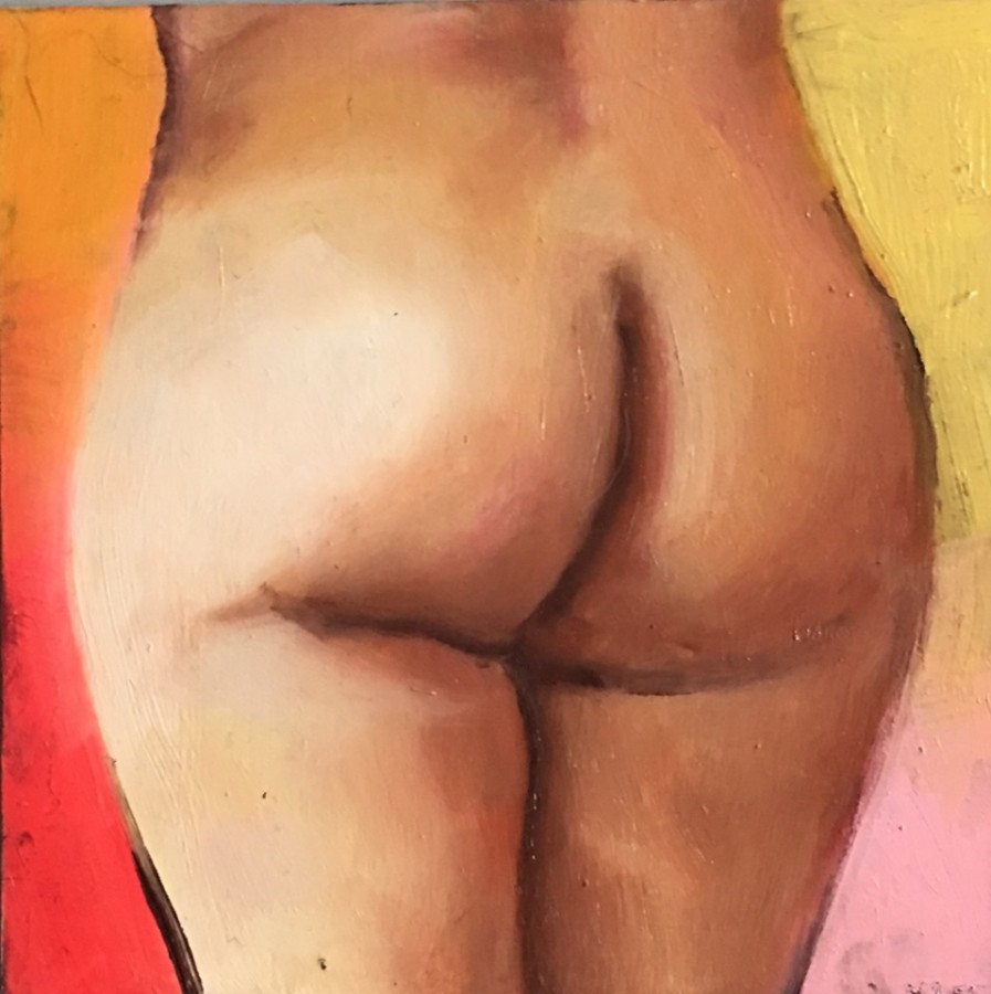 The rear human pleat contains a universe of possibilities. A cornucopia of celestial delights. But its visual attributes don’t reveal personality traits. Bouncy, bubbly, and blushing don’t equate to butch, bookish, and boundless. If you’re looking for binaries, you’ll easily be fooled. When you’re from a small town, like Kit Everson is, access to a community of like-minded queers is facilitated by the internet. IRL isn’t easy, so flirtation arrives in a cheek clap. A prized posterior nude pic. A one-eyed wink saying, “Hey, friend. Lovely to meet you. Is it hot in here or is it just me?” Many of these images capture their subjects in the most prone of positions. An offering that also says, “I trust you.” I can’t think of a more supportive reply than, “Okay. I’ve got your back.” By closely observing these photos and rendering them in paint Kit is saying exactly that. Queer folks of the world, Kit’s got you!